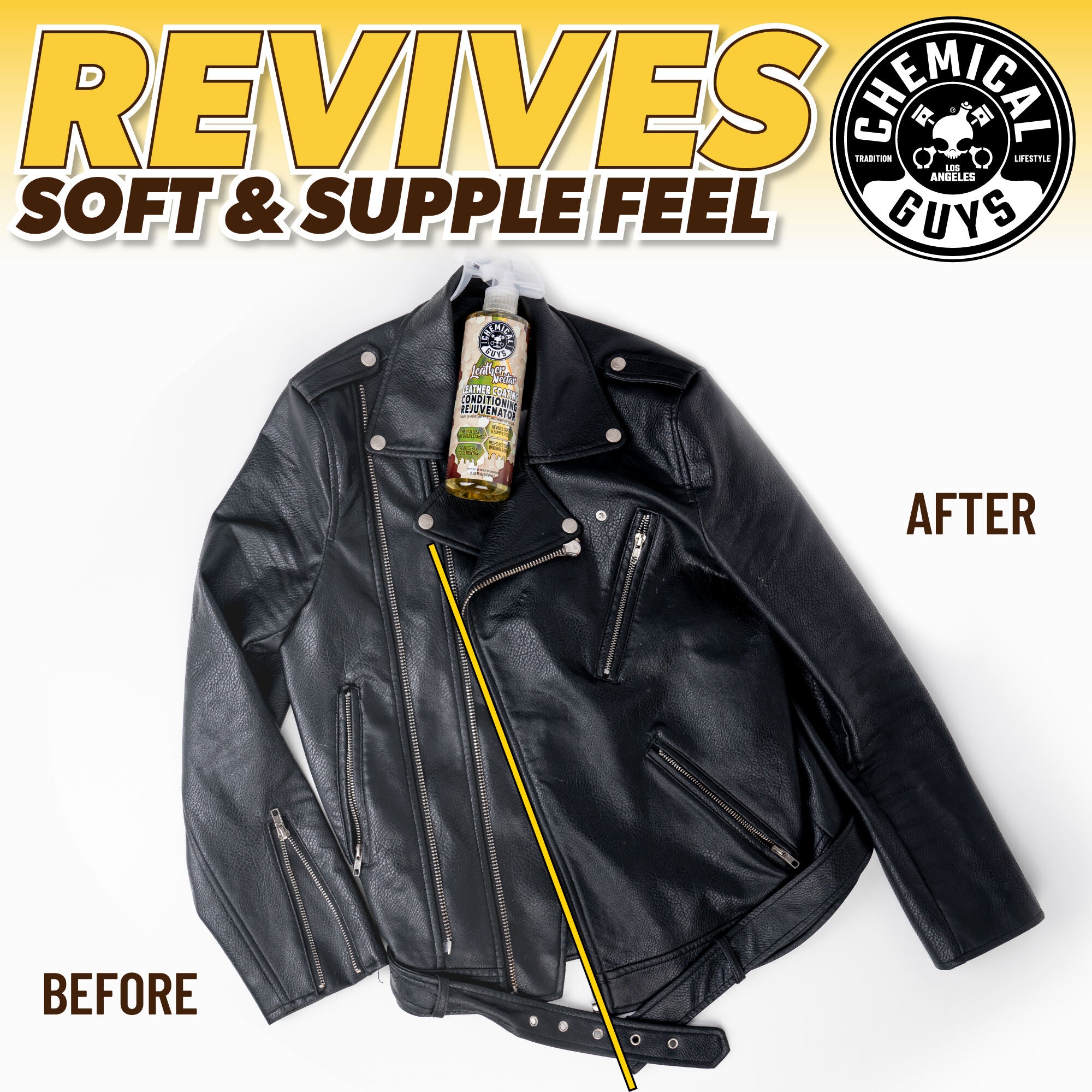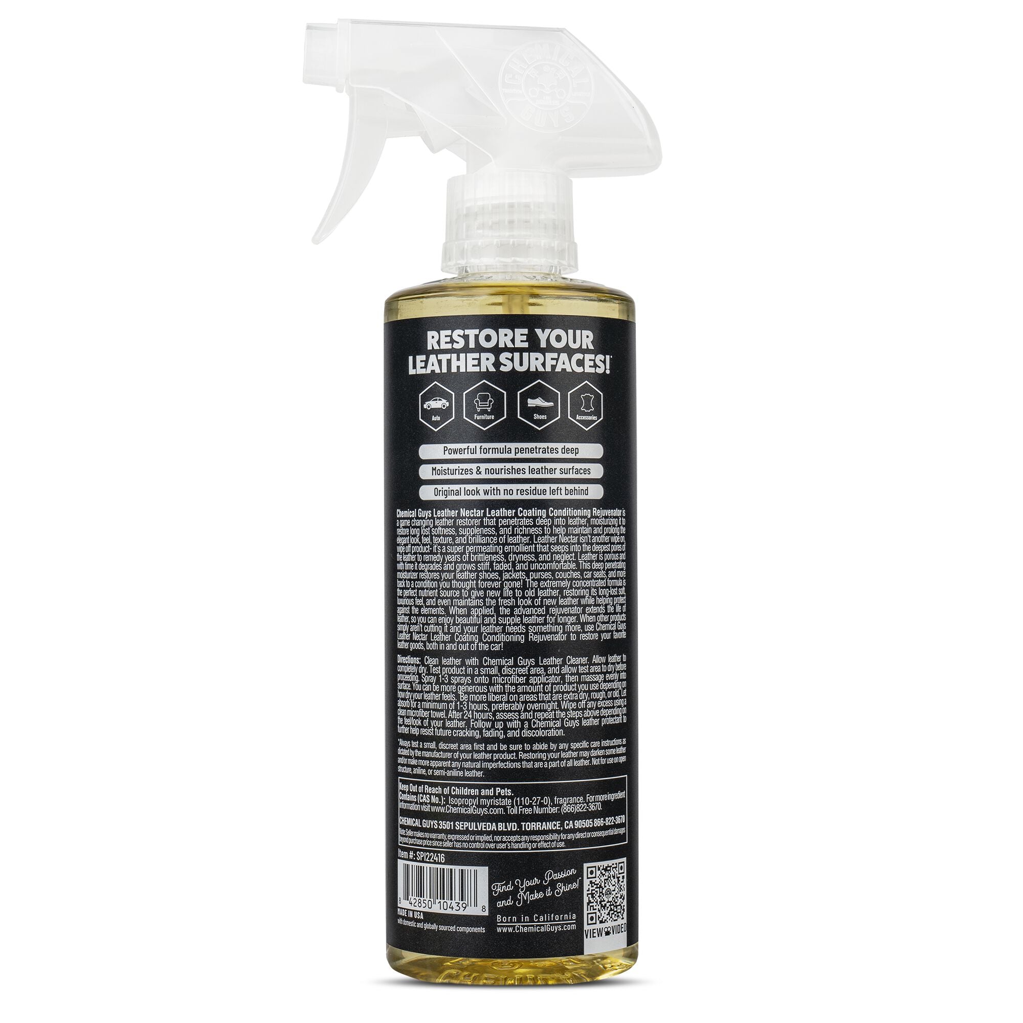 Chemical Guys Leather Nectar Leather Coating Conditioning Rejuvenator is a powerful leather restorer that penetrates deep into the pores of leather. moisturizing it to restore long lost softness. suppleness. and richness to help maintain and prolong the elegant look. feel. texture. and brilliance of leather.