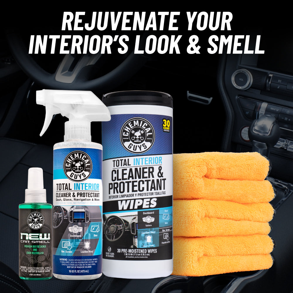 Want to restore that fresh off-the-lot look and feel to your ride’s interior? This kit lets you easily clean and protect your interior with two different versions of Total Interior Cleaner & Protectant while New Car Smell Air freshener leaves your vehicle’s interior smelling like a brand-new car!