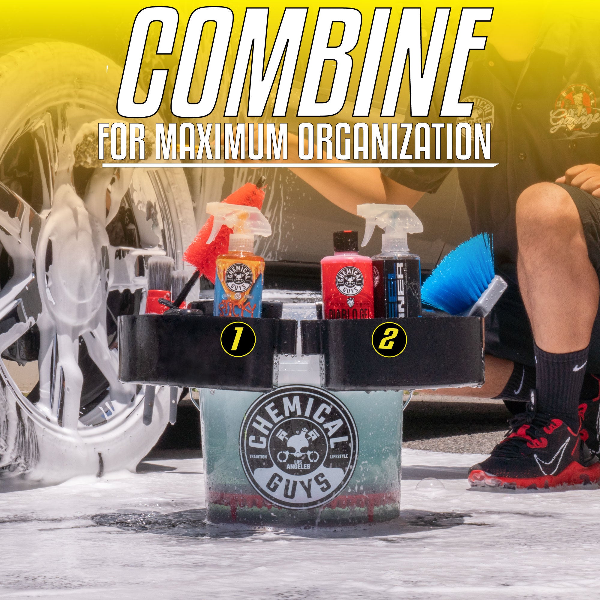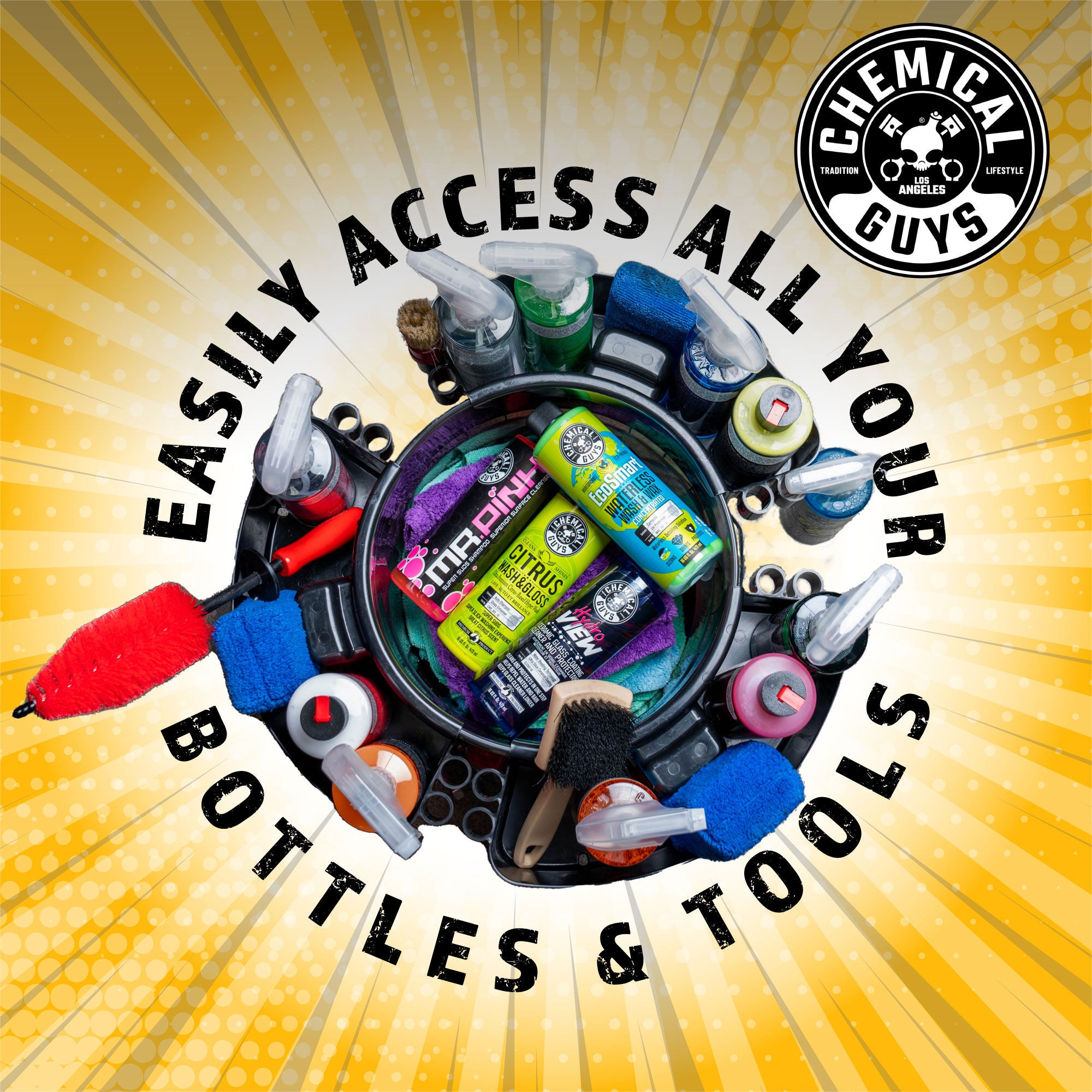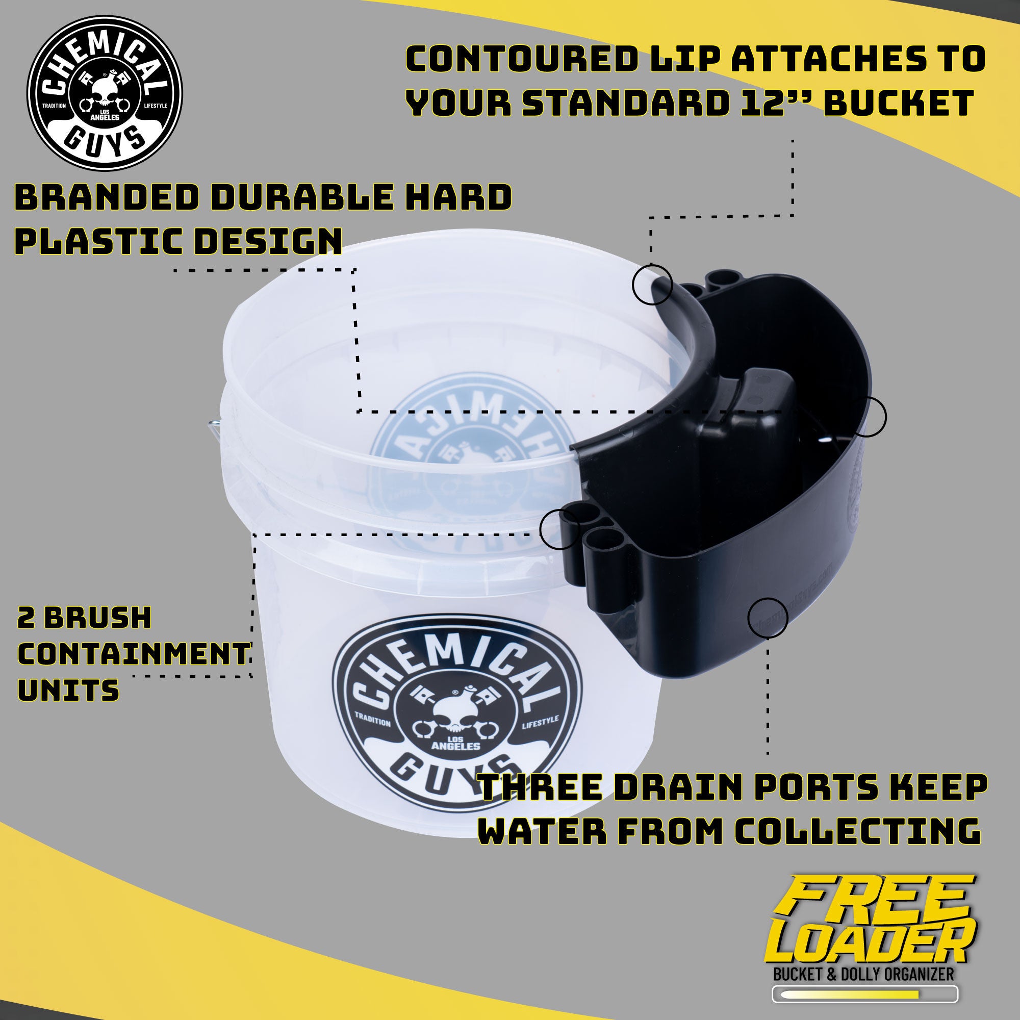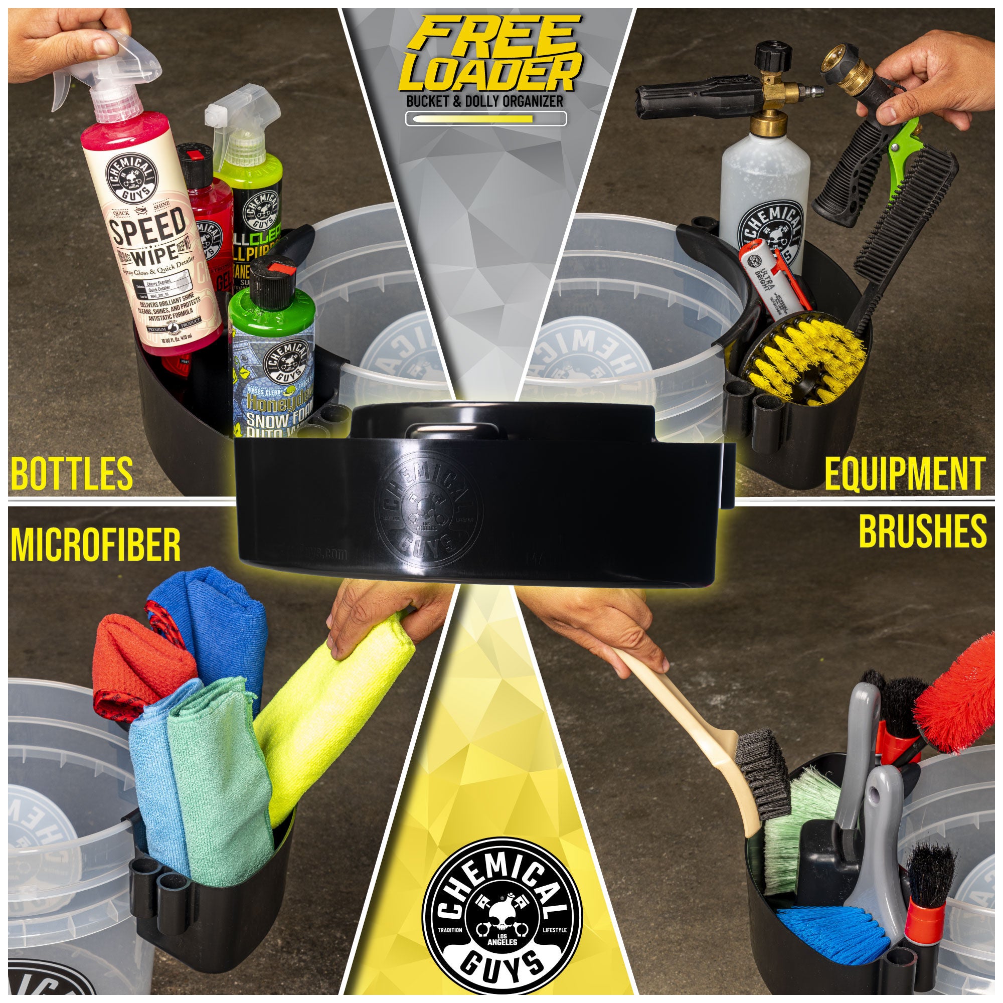 The Freeloader Bucket & Dolly Organizer is the easy way to store and access all your supplies while you detail! Your detailing arsenal is always within an arm’s reach with two brush containment units. Attaches to your heavy-duty bucket.